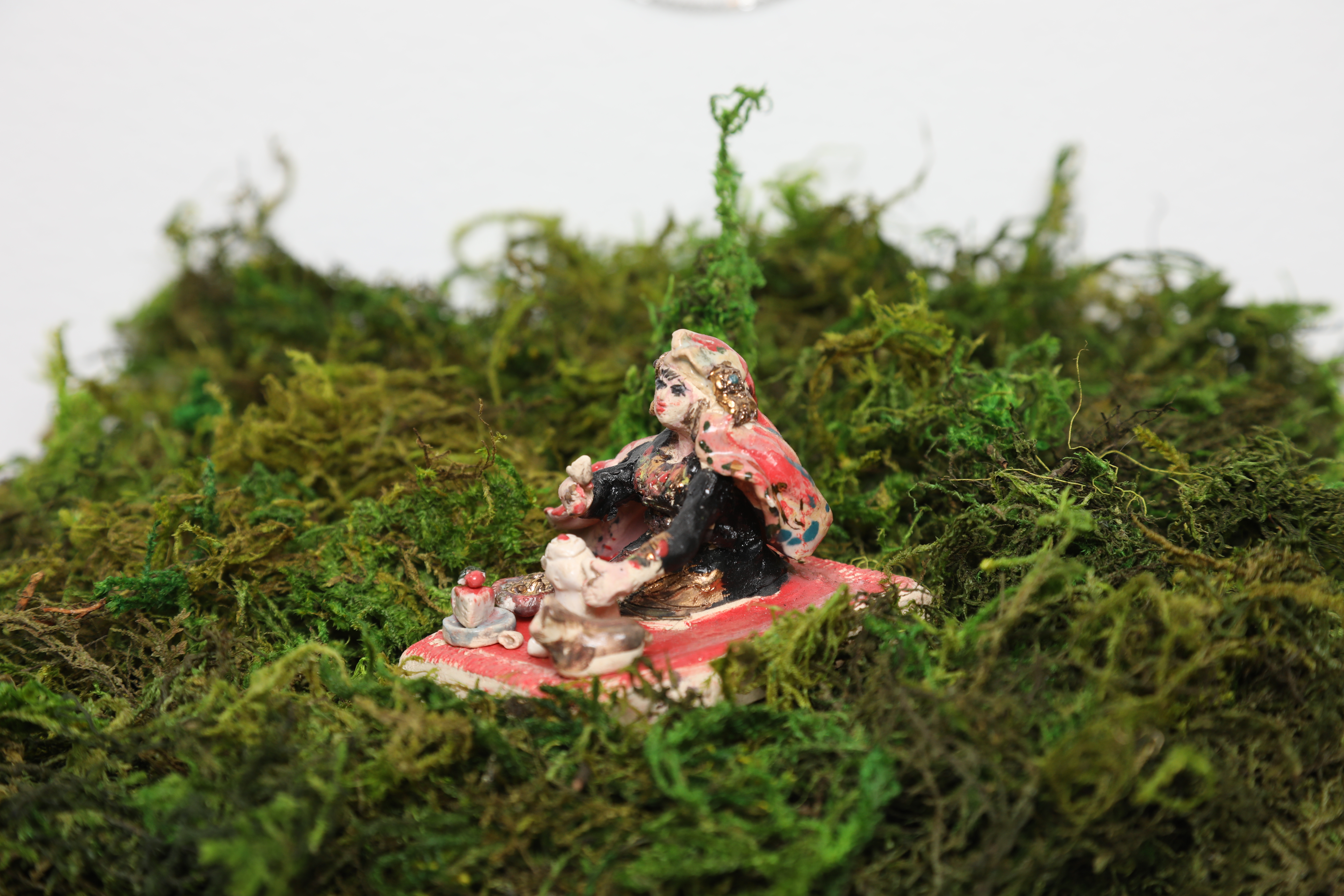 This miniature ceramic sculpture captures a beautiful and romantic moment of solitude for a Southern Saudi girl. She is picnicking with her cat in a beautiful garden, surrounded by her Saudi coffee pot and a cheesecake.