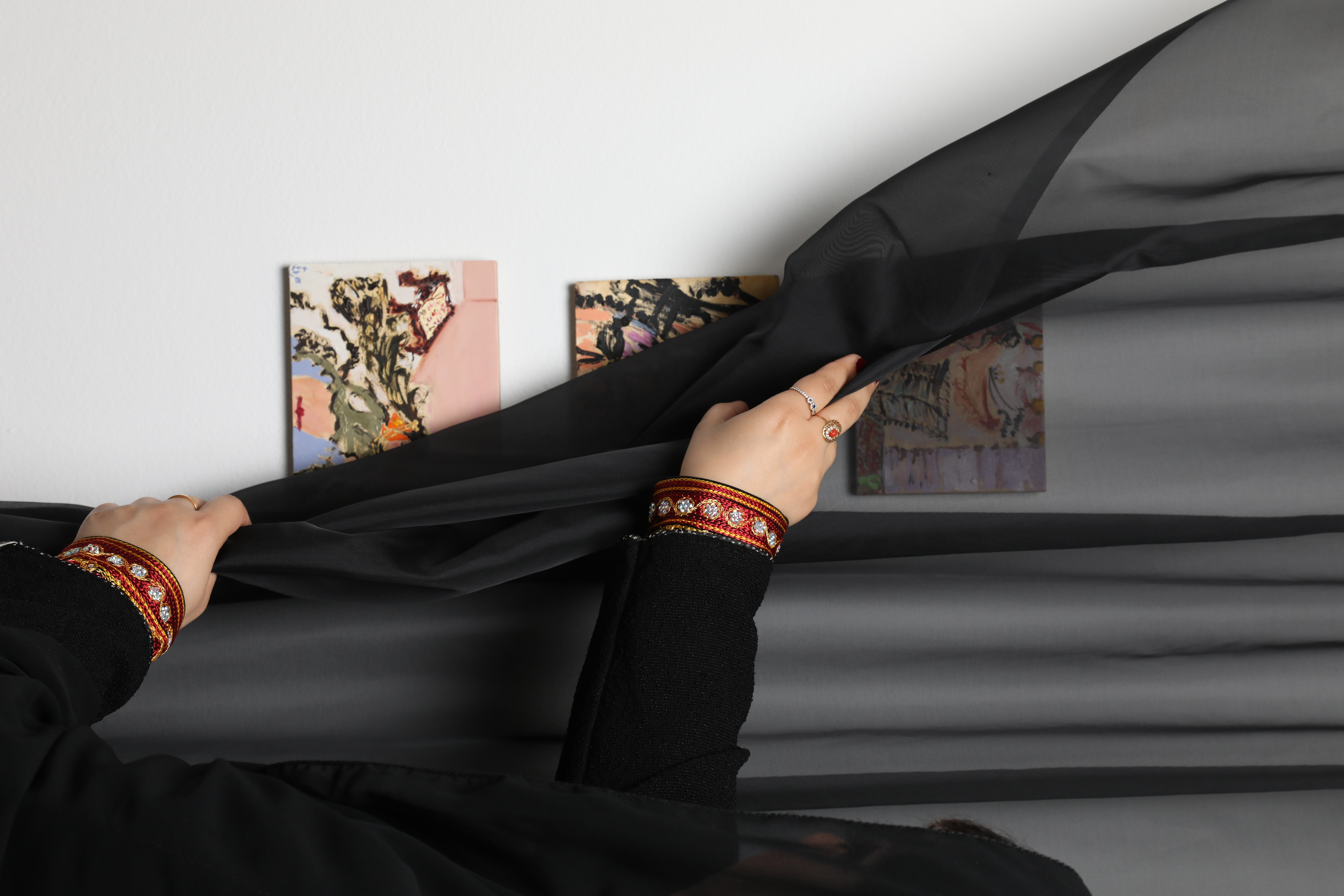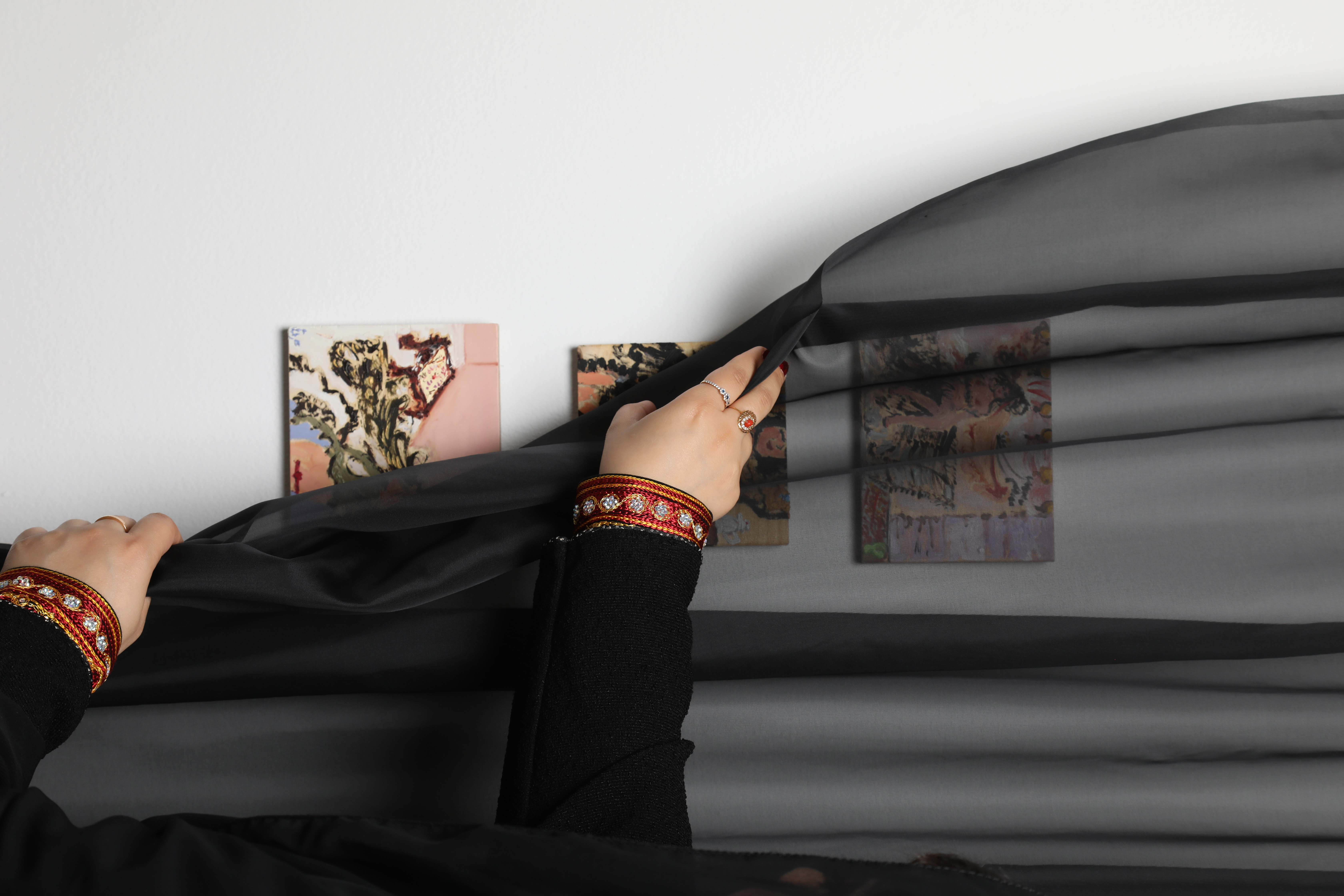 This body of work captures the romantic lives of Saudi women. Intimate scenes that need such a privacy even when showcased. I displayed this body of work with an interactive element. Viewers were invited to move the curtains to view the work due to its sensitive nature. The Shailah or Tarhah (veils), the Head jewelry, the brattiness. All of it.